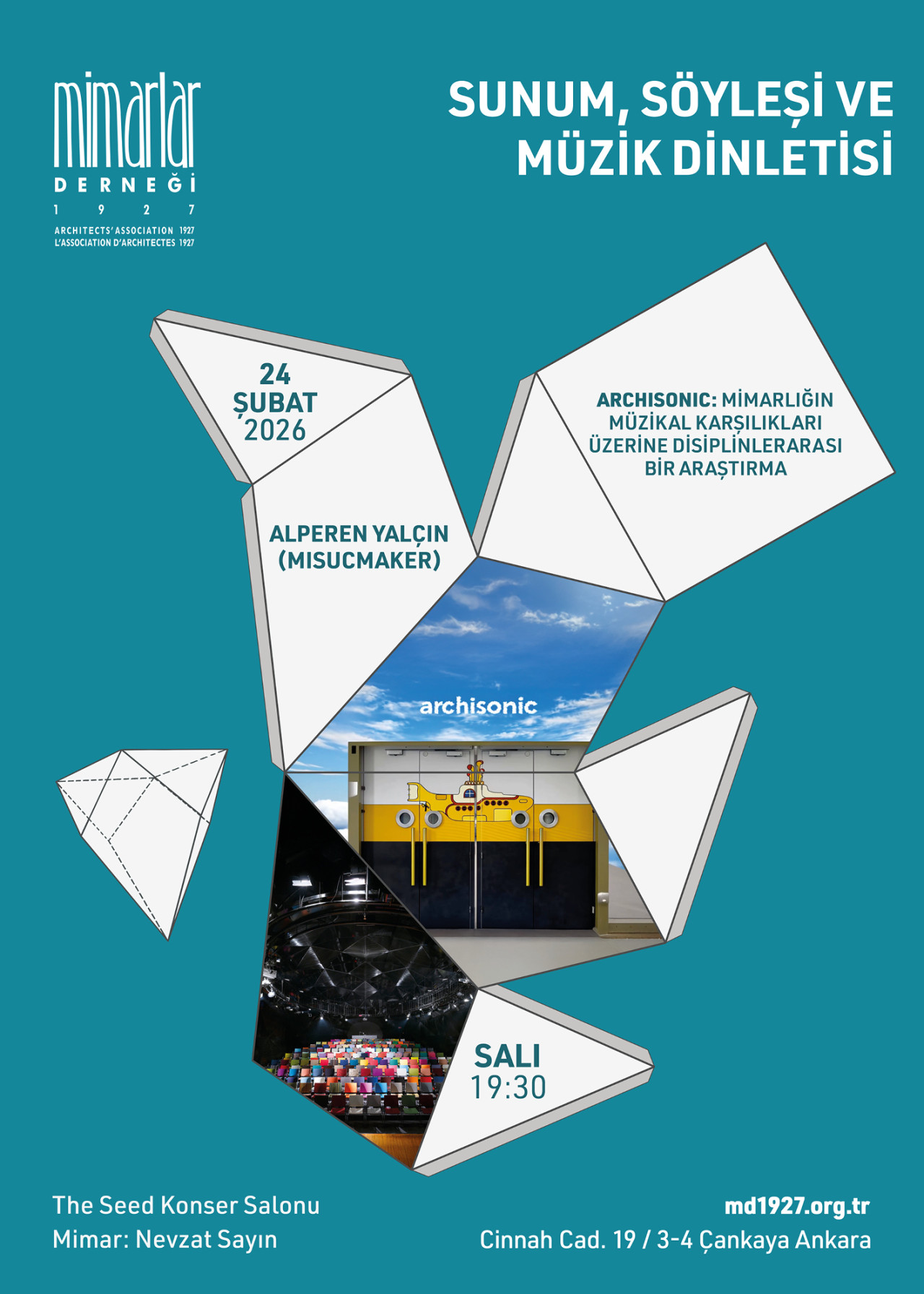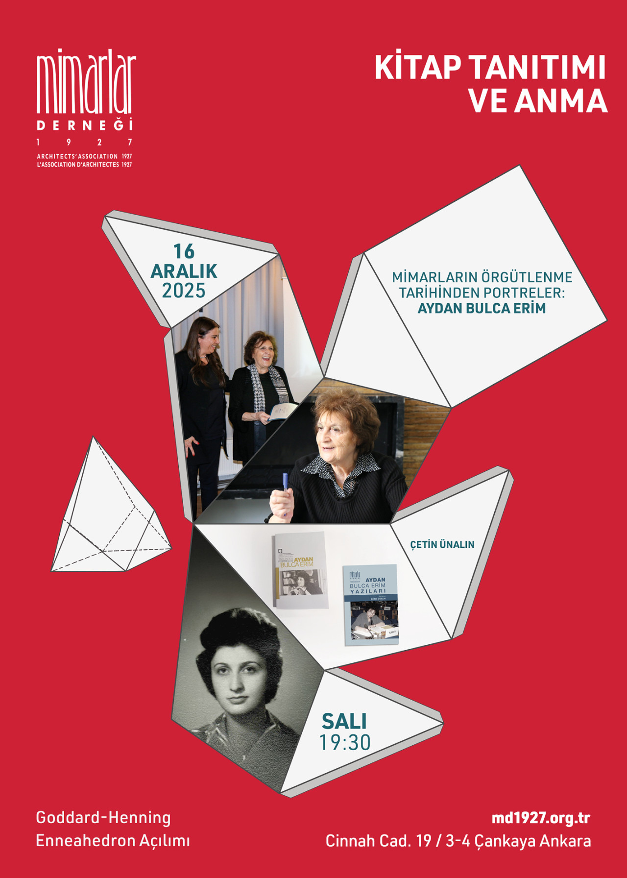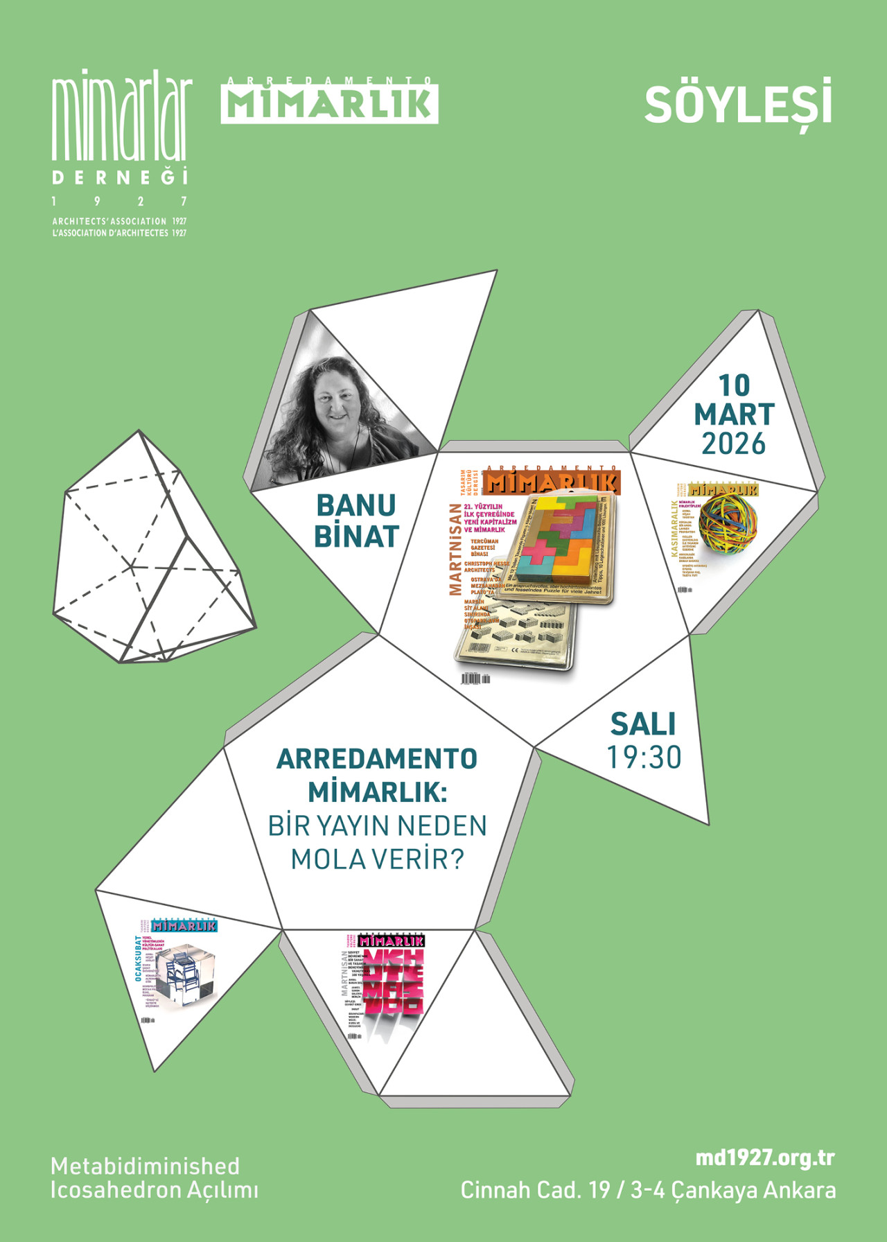 Mimarlar Derneği 1927, Türkiye’de en eski bağımsız mimarlık meslek kuruluşudur. Cumhuriyet’in ilanından dört yıl sonra “Türk Mimarlar Cemiyeti” adıyla kurulmuş ve farklı isimler altında günümüze dek faaliyetlerini sürdürmüştür. Dünya Mimarlar Birliği’nin kurulmasına katkıda bulunmuş (UIA 1948), TMMOB ve Mimarlar Odası’nın kuruluş sürecine tüm imkanlarıyla destek olmuştur. Mimarlar Odası’nın 1954’de kurulmasının ardından, mesleki görevini kültürel ve sosyal programlarla sınırlamış olan Dernek, etkinliklerine Ankara’nın modernist bir ikon yapısı olan Cinnah 19’daki yeni mekanında devam ediyor.